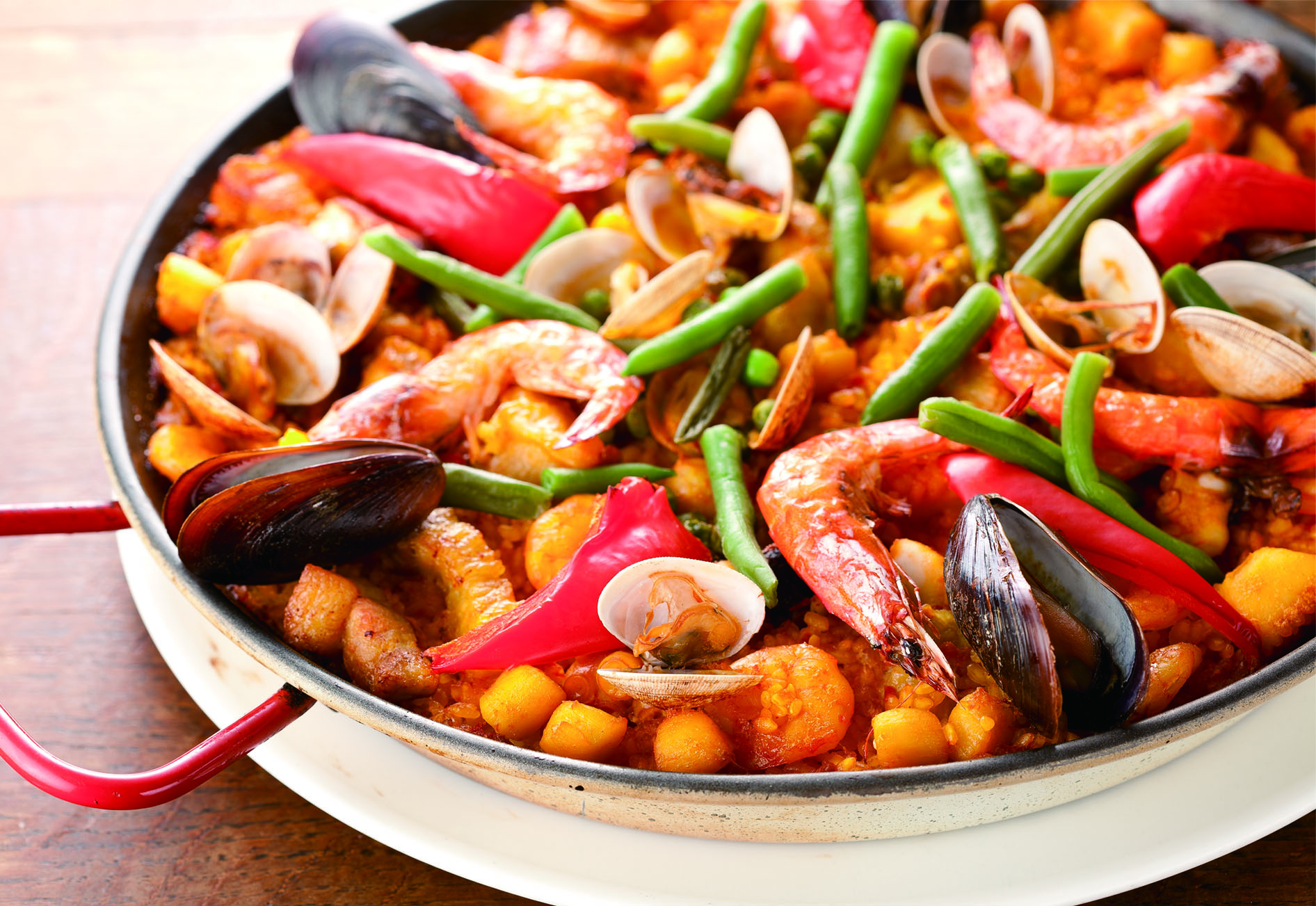 スペイン料理を代表するパエリアはバレンシア地方発祥です。海老、ムール貝、イカなどの魚介類を使ったものが有名ですが、元々は漁師が捕らえた獲物と米を一緒に煮込んだものが始まりと言われ、ウサギ、鶏、カタツムリなどの山の幸を中心にして作られています。